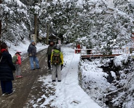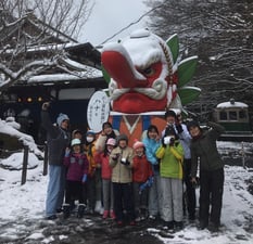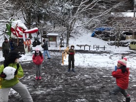 そして、12月27日の活動⽇当⽇、叡電きららにて⼦どもたちと乗り合わせて(出町柳から鞍⾺)⽐叡⼭に向かいました。当⽇はとても寒く、⼭に近づくほど雪景⾊になっていき、⼦どもたちとその景⾊を楽しみました。⽬的地に到着した後は、メンバーが全員揃うまでの間、しばらく雪合戦や雪だるま作りなど雪遊びを楽しみ、登⼭に向かいました。子どもたちは、⼭道の中でもつららを取ったり、積もった雪の中にダイブしたりと、道中でも全員元気いっぱいで⾃然を楽しんでいました。